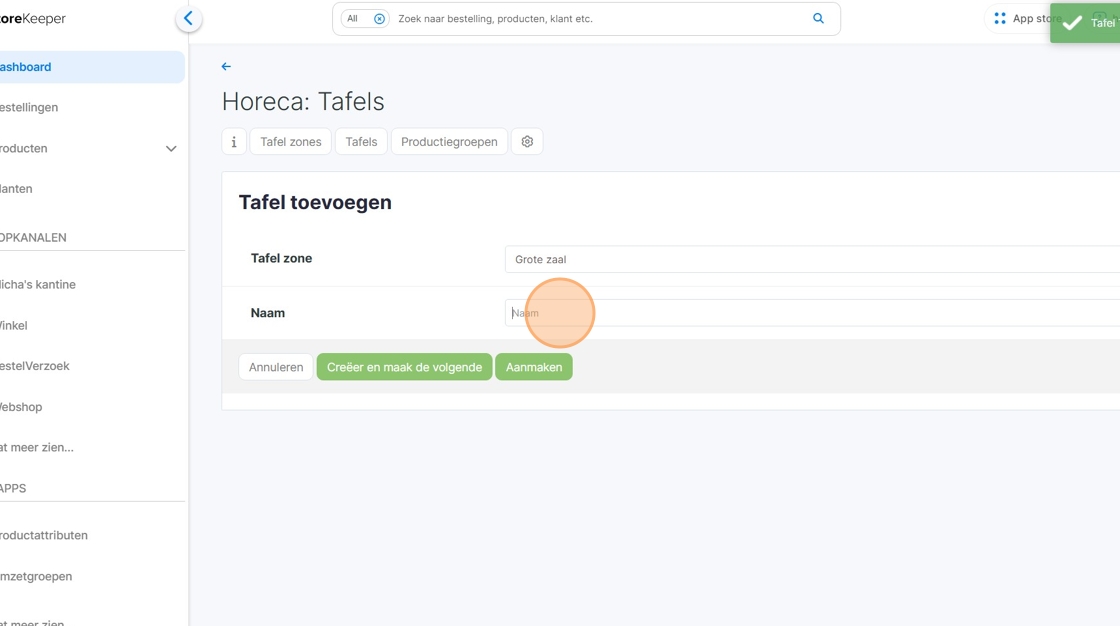 15. Vul de gewenste naam of nummer voor de tafel in. In dit voorbeeld gebruiken we "Tafel 1", Tafel 2 en verder oplopend.