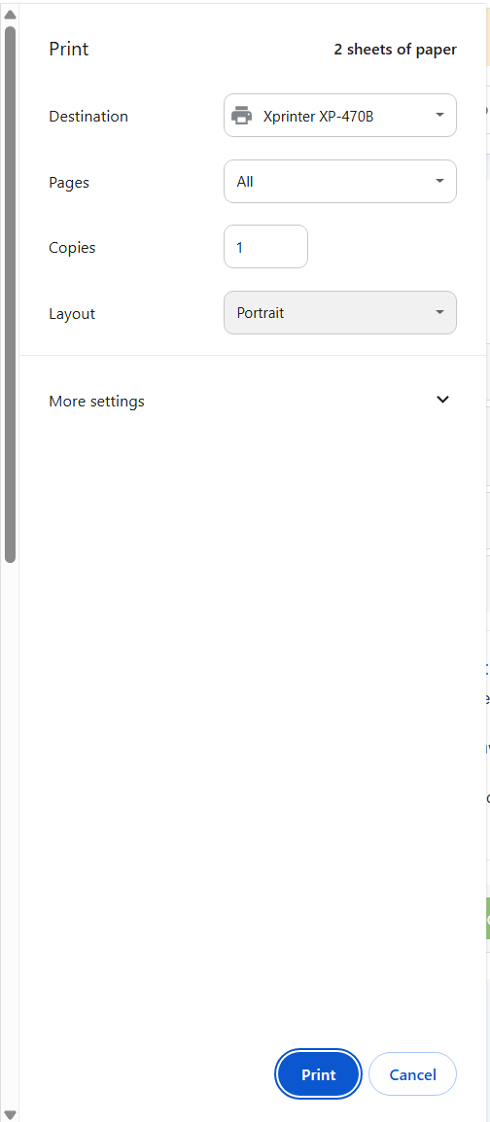 16. Je krijgt nu een popup waar je de juiste printer kunt selecteren. Klik op "print" om de etiketten af te drukken.