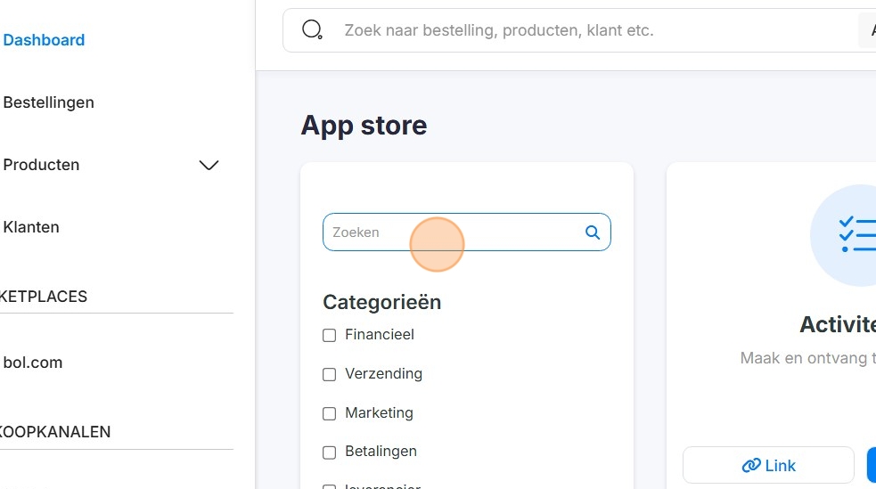 7. klik het zoekveld aan en type de omschrijving van het gewenste product in. Voor dit voorbeeld gebruiken we "hoodie".