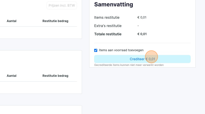 6. Je keert nu terug in het orderscherm. Hier dien je daadwerkelijk te crediteren.