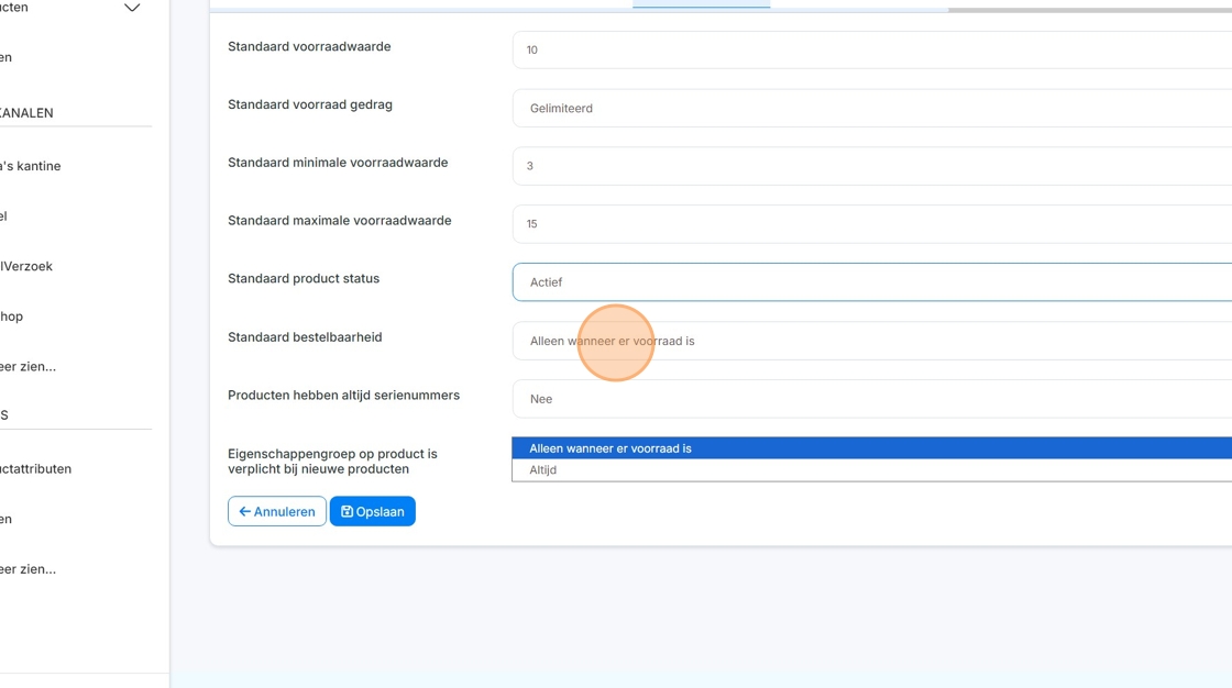 13. Bij "Standaard bestelbaarheid" kun je kiezen uit "Altijd" en "Alleen wanneer er voorraad is".